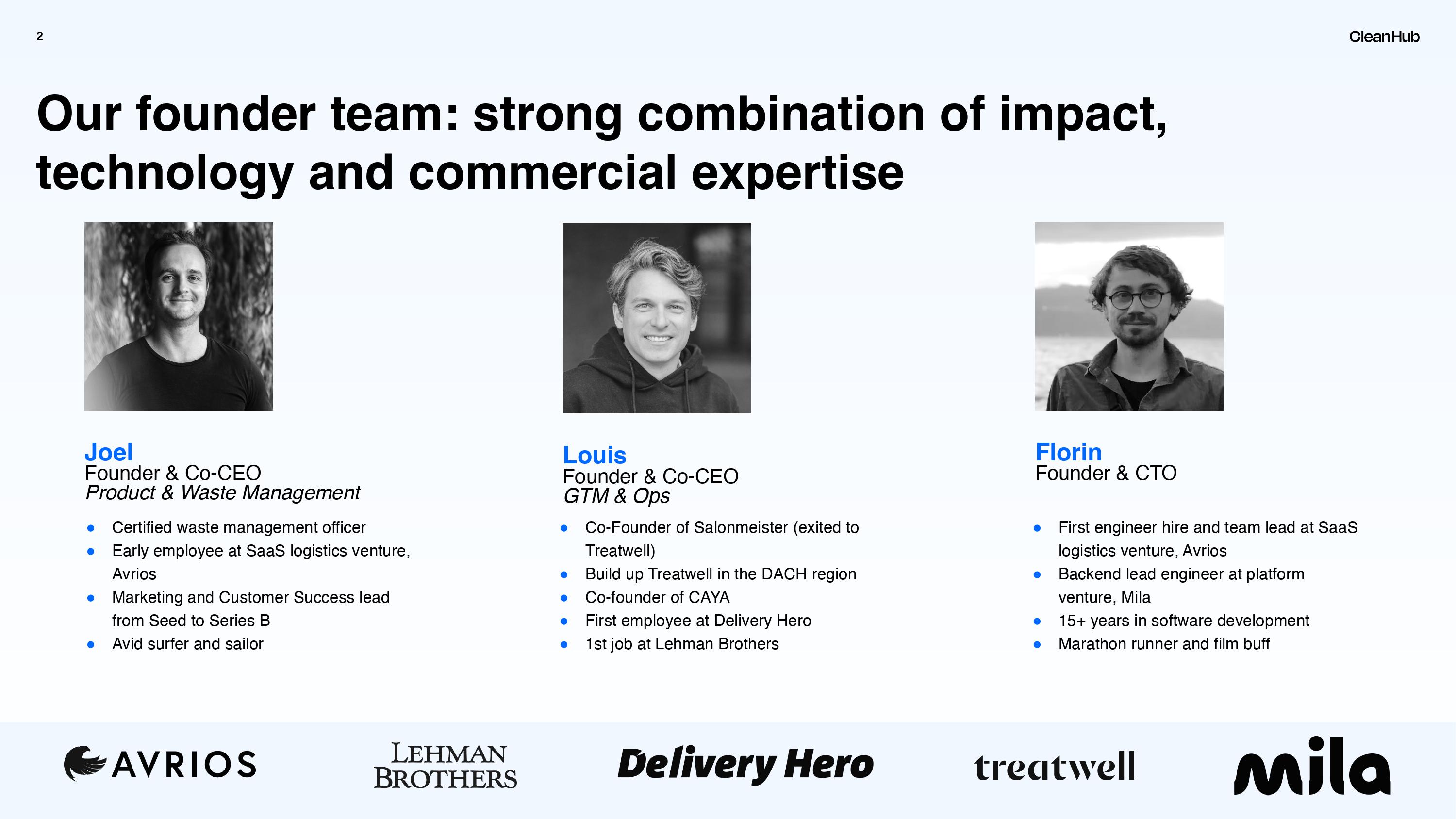 CleanHub has two co-CEOs, which gives me pause. The CEO’s role is typically well-defined, and two in this case isn’t always better than one. I would push the team here, focusing on conflict-resolution skills. The answer as to why there are two CEOs could trigger a number of red flags about team cohesion and staying power.