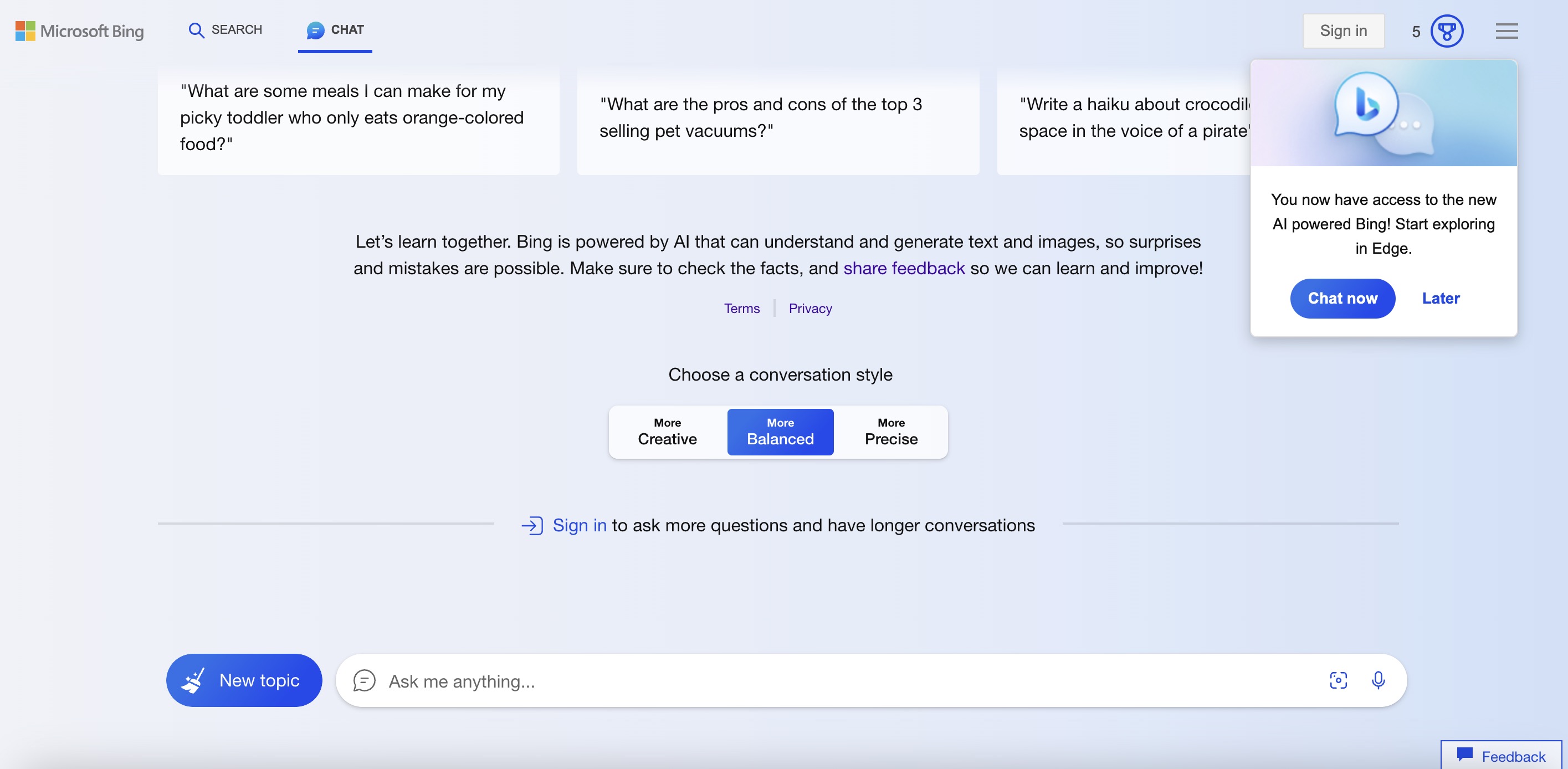 According to those who gained access to the Bing AI chatbot on Windows, they received a pop-up in the Windows 10 or 11 taskbar, offering the opportunity to try the Bing AI in Chrome. Otherwise, users can head to Bing.com from their preferred browser, then click on the “Chat” icon to try out the experience. In our own tests, however, we could access Bing Chat in Chrome, but not Safari at this time. That could be because we’re not among the “select users” who were gaining access during the tests.