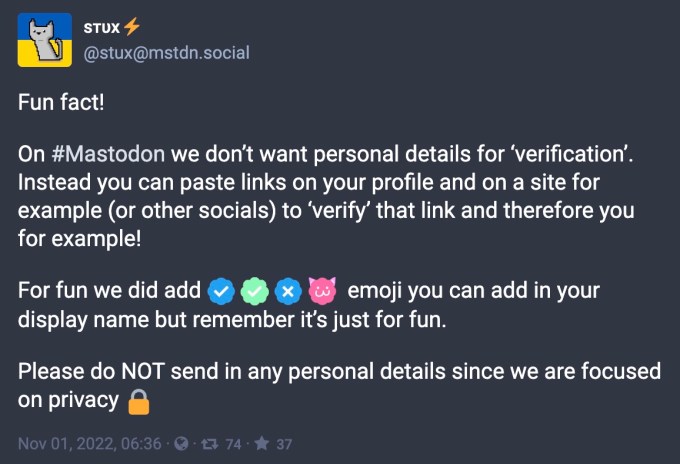 Some servers are having fun with the idea of verification in a less-than-official fashion. For example, the mstdn.social server lets you add blue-and-white checkmarks and other emoji to your display name if you’d like, which make you look verified, even though these don’t mean anything. (Sort of like Twitter’s new verification system! But for free!)