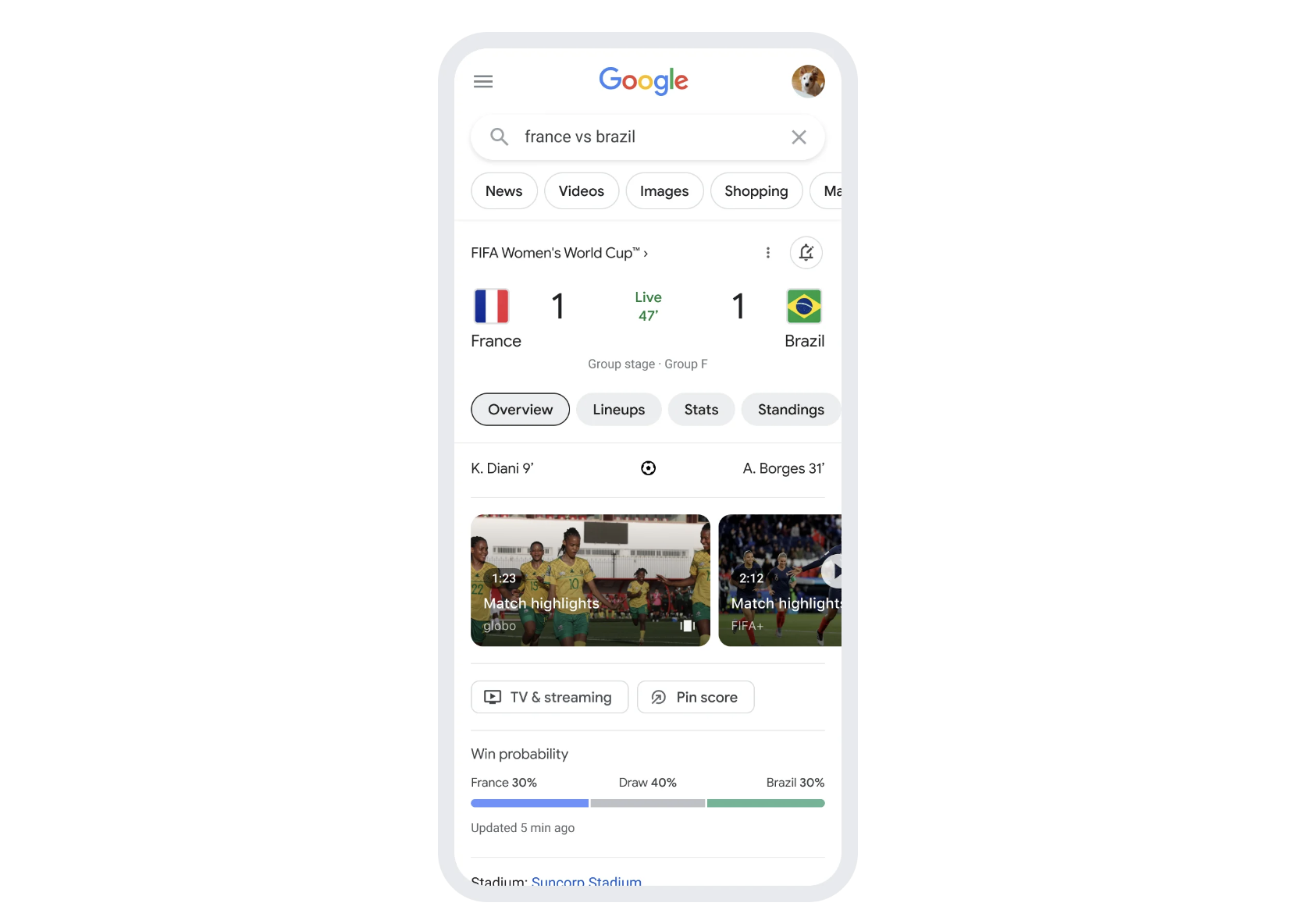 For this year’s FIFA Women’s World Cup, users will be able to watch official highlights, follow their favorite teams, get notifications throughout the games and browse stats like head-to-head records, recent form and win probability.