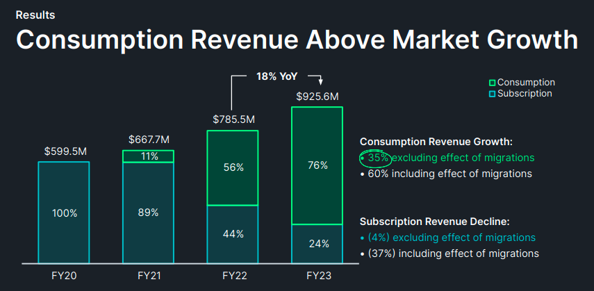 In its Analyst Day presentation, New Relic pitched its new fiscal year as a period of “acceleration” and forecast more than 30% growth in consumption revenue and free cash flow of $150 million. So far, it is meeting that consumption revenue growth forecast and is making good progress toward its cash-flow goals.