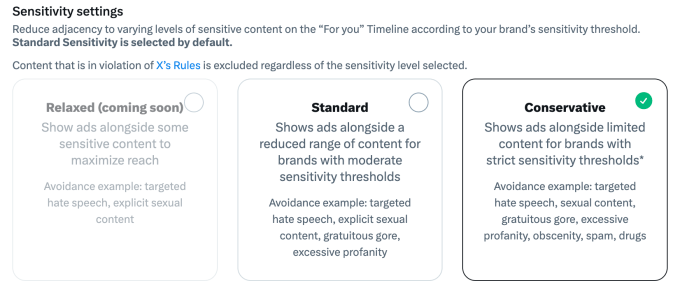 X is expanding its partnership with Integral Ad Science (IAS), which it began working with in January to tell advertisers if their ad is placed around inappropriate content. Now, X is testing sensitivity settings, powered by machine learning, that let advertisers choose their thresholds for the kinds of content they want their ads to appear around — and according to a tweet from X owner Elon Musk, advertisers can buy these less desirable, “relaxed” sensitivity ad slots for less.