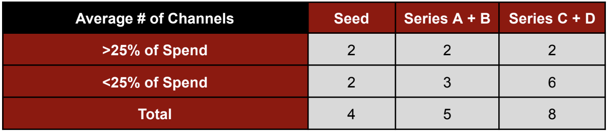 This was agnostic of company size as well. While our later-stage portfolio companies tended to diversify their marketing efforts and invested in a larger number of channels as opposed to their earlier stage counterparts, our companies consistently maintained a strategic focus on just two core marketing channels that made up greater than 25% of their annual spend.