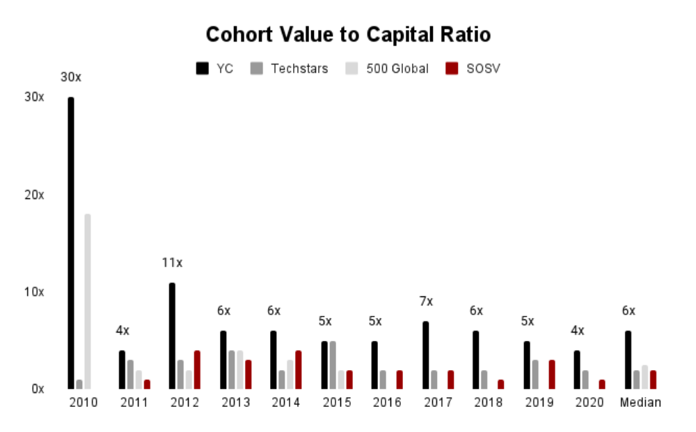 In addition, the cohort value to capital ratio is significantly higher at YC, with a median of 2x to 3x all other accelerators.