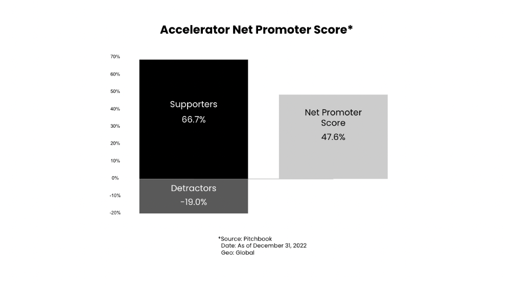 What is concerning about this feedback is that these areas of required improvement are precisely what accelerators are supposed to deliver. Further validating this troubling reality is the average accelerator’s Net Promoter Score (NPS) of just 47.6%. This is a relatively low NPS on a scale of –100 to +100 for a bespoke service that should change the trajectory of an entrepreneur’s career. This begs a very important question: Do accelerators really deliver better than traditional VCs?