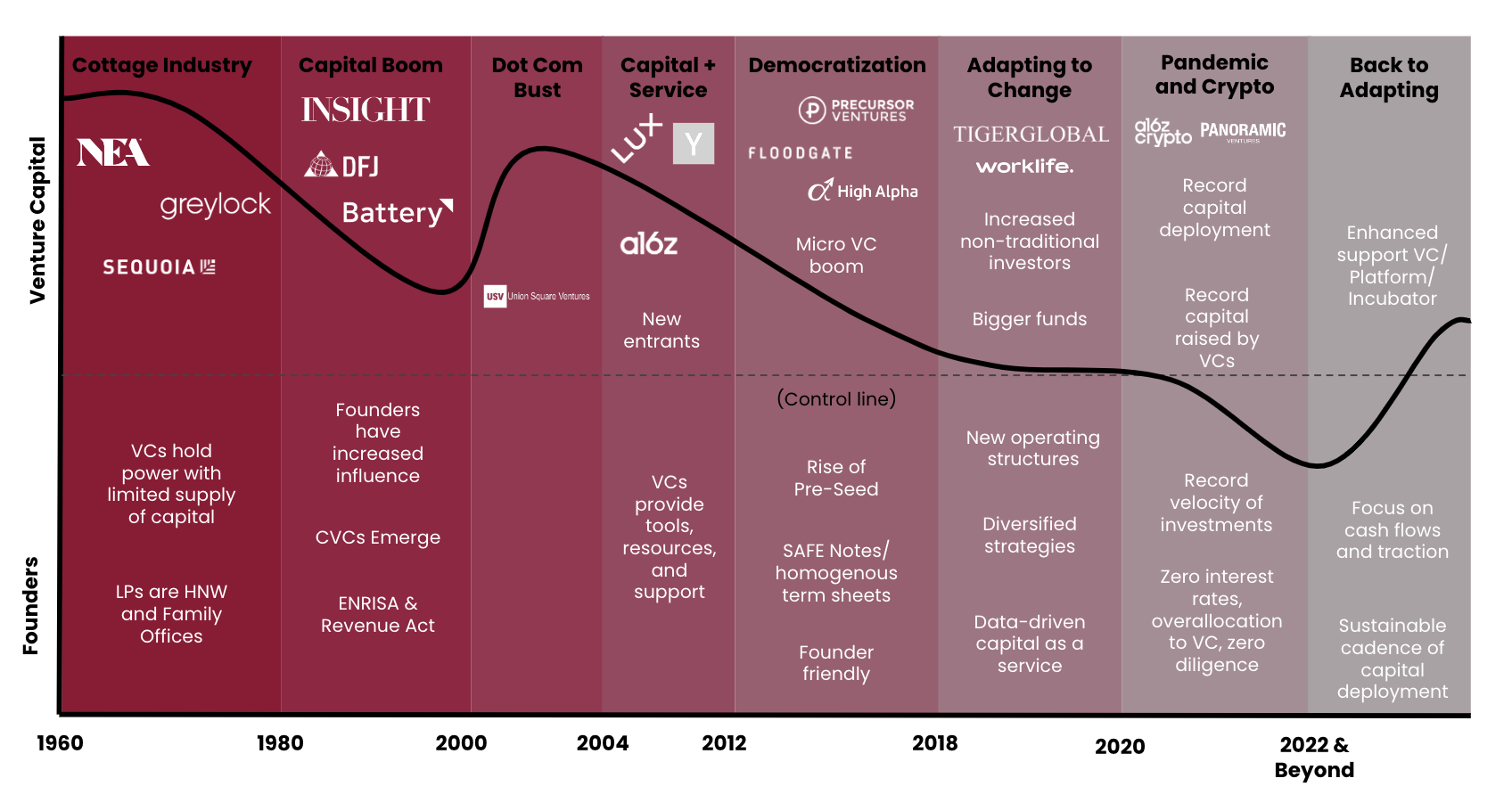 That said, it’s not just micro VCs or emerging managers who are launching platforms; brand names are, too. For example, Sequoia Capital’s Arc or a16z’s Crypto Startup School attracts quality with favorable terms, capital, and a strong brand. The chart below shows how VCs have adapted through market cycles: