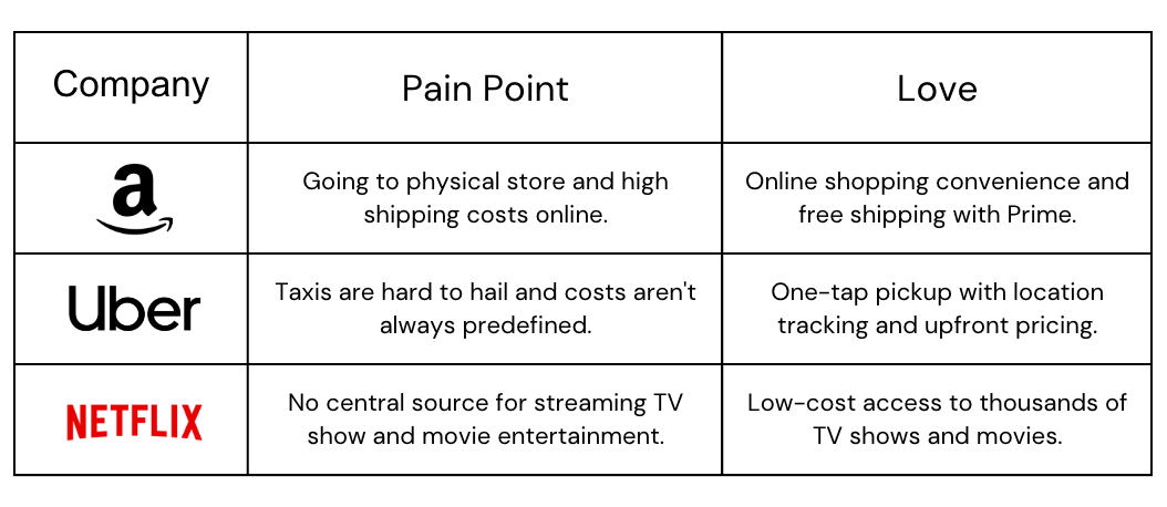 In this chart, companies such as Amazon can easily craft messaging based on the simple exercise of discovering why customers return. If you know what your startup is solving and what customers love the most about your solution, the copy for marketing collateral (i.e., for ads) will come naturally.