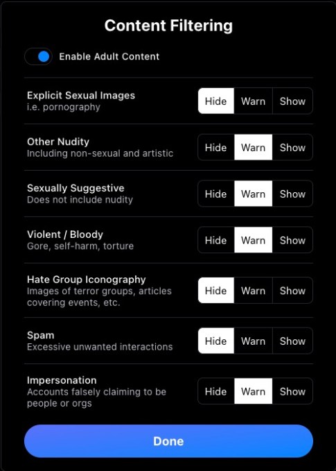 Bluesky has a detailed moderation settings page, which allows users to hide or show a warning to them when they encounter posts related to different categories — including explicit sexual images, nudity, spam, violence and suggestive.