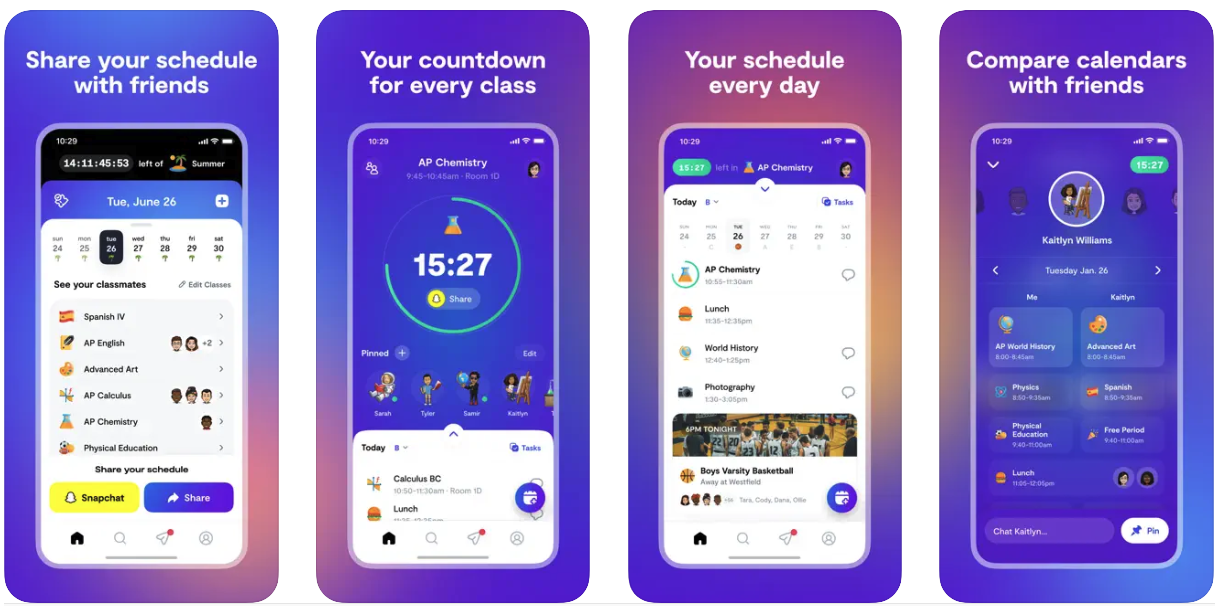The free app is for students 13 years or older (9th through 12th grade) to share class schedules with classmates, organize club meetings/sports practice/parties, discover local events, chat with others and manage their calendars.