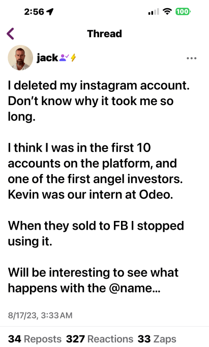 The timing of the account deletion is, of course, interesting, given that Instagram is now competing in the same market as Twitter with its own microblogging app, Threads. Dorsey retained a stake in Twitter, now X, after Elon Musk’s acquisition — a fact Dorsey reminded another Nostr user of earlier this month, in response to a screenshot of Google Bard’s incorrect AI-generated output that had dubbed Dorsey a winner from the Twitter sale.