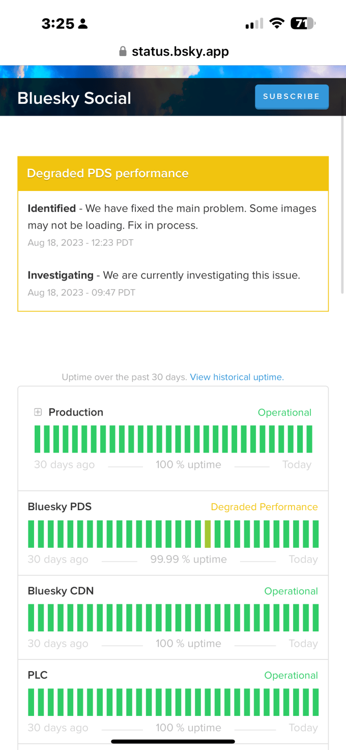 The Bluesky status page, meanwhile, published a message that it’s seeing degraded PDS performance, and noted, “We are currently investigating this issue.”