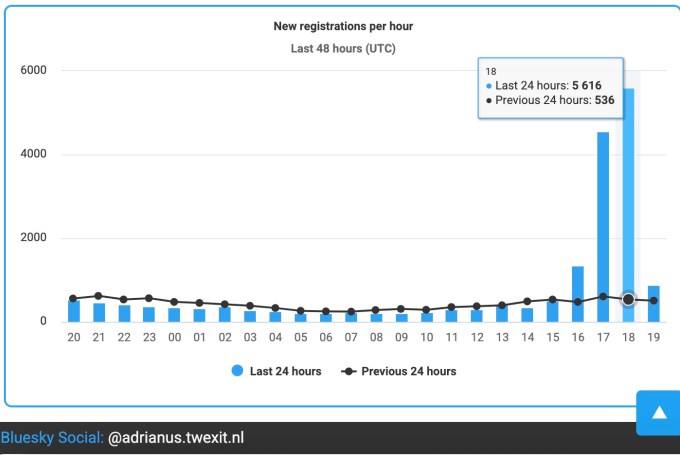 However, data from a source that leverages the Bluesky API to track new user registrations indicates that the decentralized social media platform has seen 5,616 new registrations in the past 24 hours, compared with 536 in the 24 hours preceding this. So it could be that more people suddenly cashed in their invite codes.