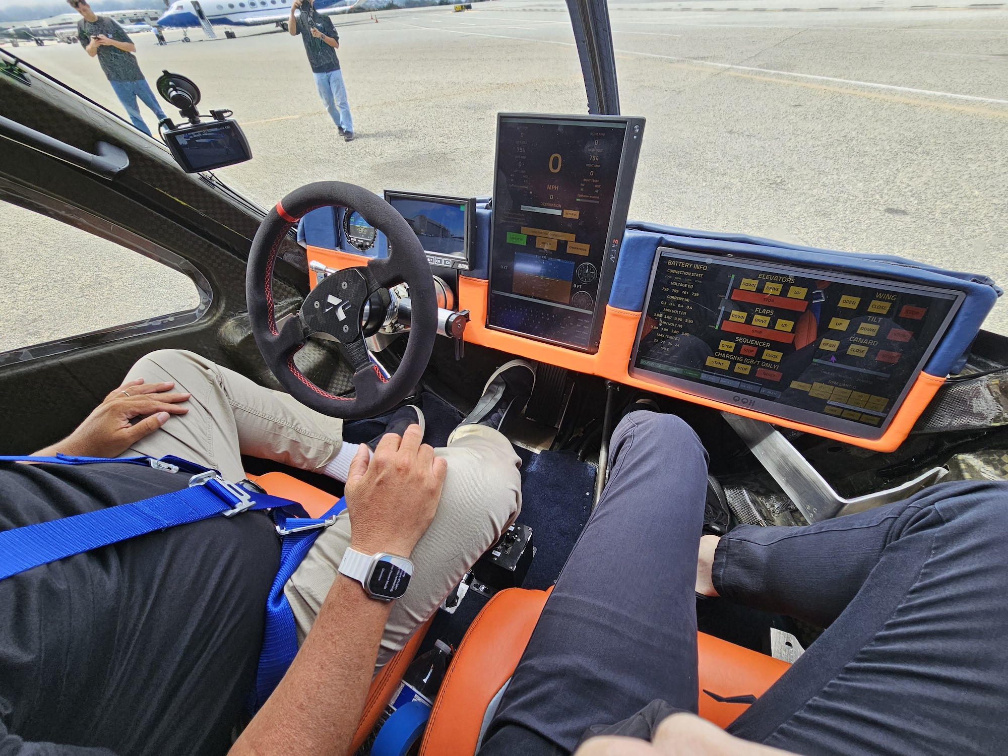 Physical controls are limited to a steering wheel, an accelerator, a brake pedal and a shifter. There are no flight controls yet, again because all piloting is remote for now.