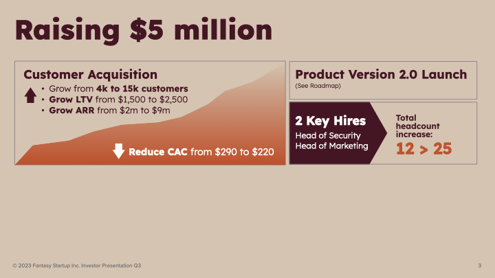 Would a company with a headcount of 25, with an ARR of $9 million, and 15,000 customers be able to raise a round that follows a $5 million round? Presumably, this would be a growth round in the $15 million to $20 million range, and given everything I know about the way these things work, I’d give them pretty decent odds at that fundraise. This slide shows that the founders are raising a sensible amount, have a clear mission for what they need to do, and are referring to specific product development targets they are planning to hit ahead of the next fundraising round.