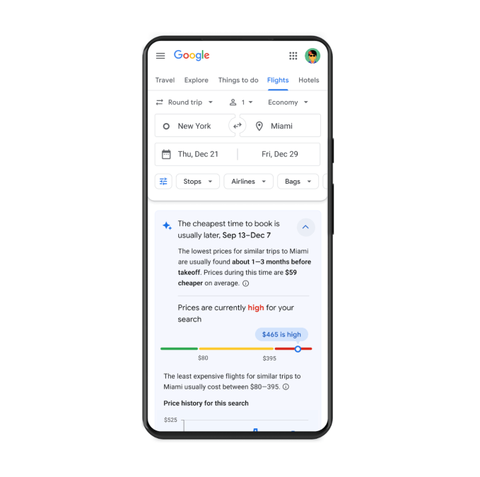 For example, Google explains, the new insights could tell users that the cheapest time to book their trip is currently two months prior to departure or that, typically, prices for their trip have generally declined closer to the date of departure. With this new understanding of whether or not they’re getting the best deal, consumers may chose to either book immediately or wait for a better price.