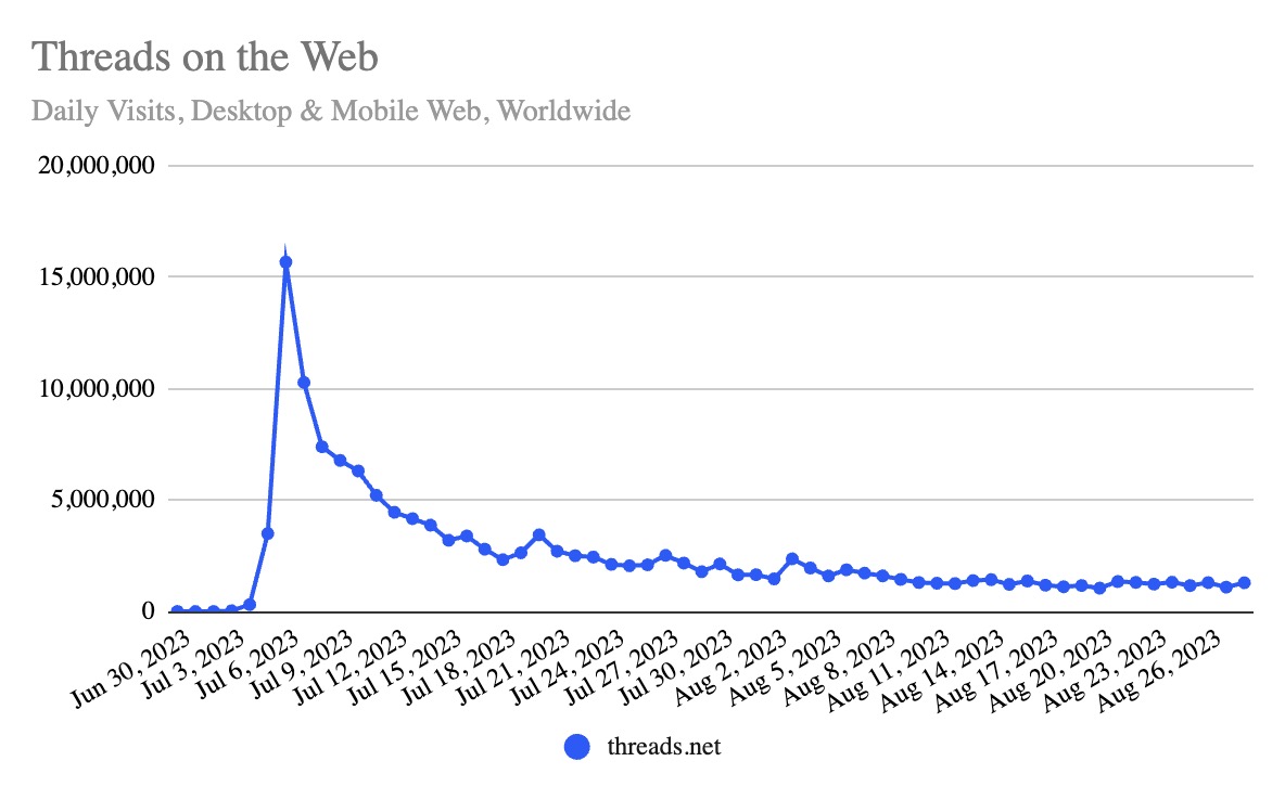 The data comes from digital intelligence firm Similarweb, which has been tracking Threads’ adoption and the subsequent tapering off in usage following the app’s blowout launch, which saw it becoming the fastest app ever to reach 100 million users — a milestone it hit in just five days.