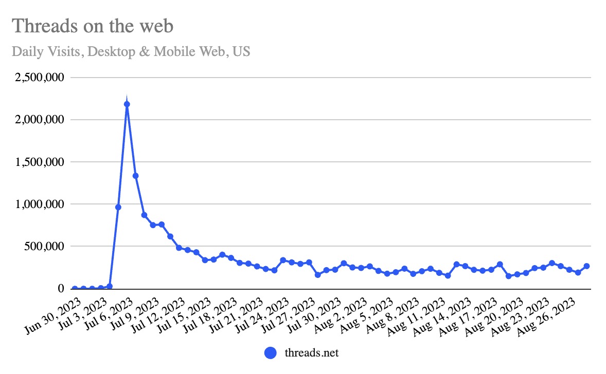 Instagram Threads users had been clamoring for a fully functional web version of the Meta-owned Twitter alternative since the app’s July debut. But last week’s release of the anticipated web app on August 22 appears to have little significant impact on Threads’ usage, new data indicates. In the U.S., Threads’ website traffic jumped up by 20% over the past week (through Monday) compared with the week prior, but it’s not clear that this could be attributed to an influx of users, rather than to switchers moving from the native mobile app to the web.
