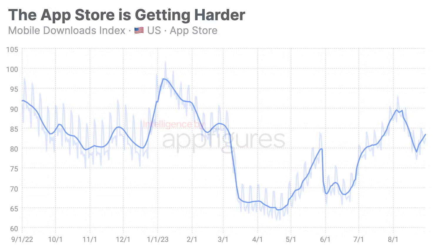 Last year, the Mobile Download Index, which tracks app installs, was 91.87. That figure means downloads were already down versus 2018 data, but not by much. As of August 31, 2023, the Index had dropped to 83.59 — that’s a drop of 8.28 points, or 9% lower than where it started, indicating a worsening trend.