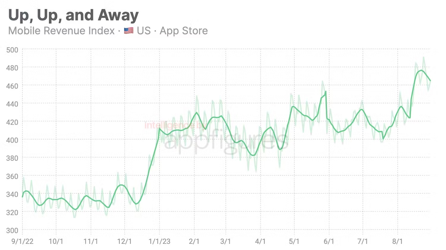But it’s not all bad news for the app economy. App revenue in the U.S. has been growing despite the decline in installs as developers turned their attention to monetization. Last year, the Mobile Revenue Index was 363.13 — much higher than in 2018. As of August 31, it’s higher still, at 458.3, or 122.17 points (36.4%) higher than where it started.