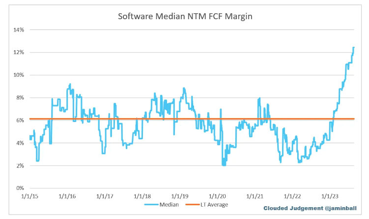 A good question to ask at this juncture is whether we’re extrapolating too much from this handful of data. We are not. Here’s a chart from Altimeter investor Jamin Ball, tracking median next-12-months free cash flow margins for a basket of public SaaS companies: