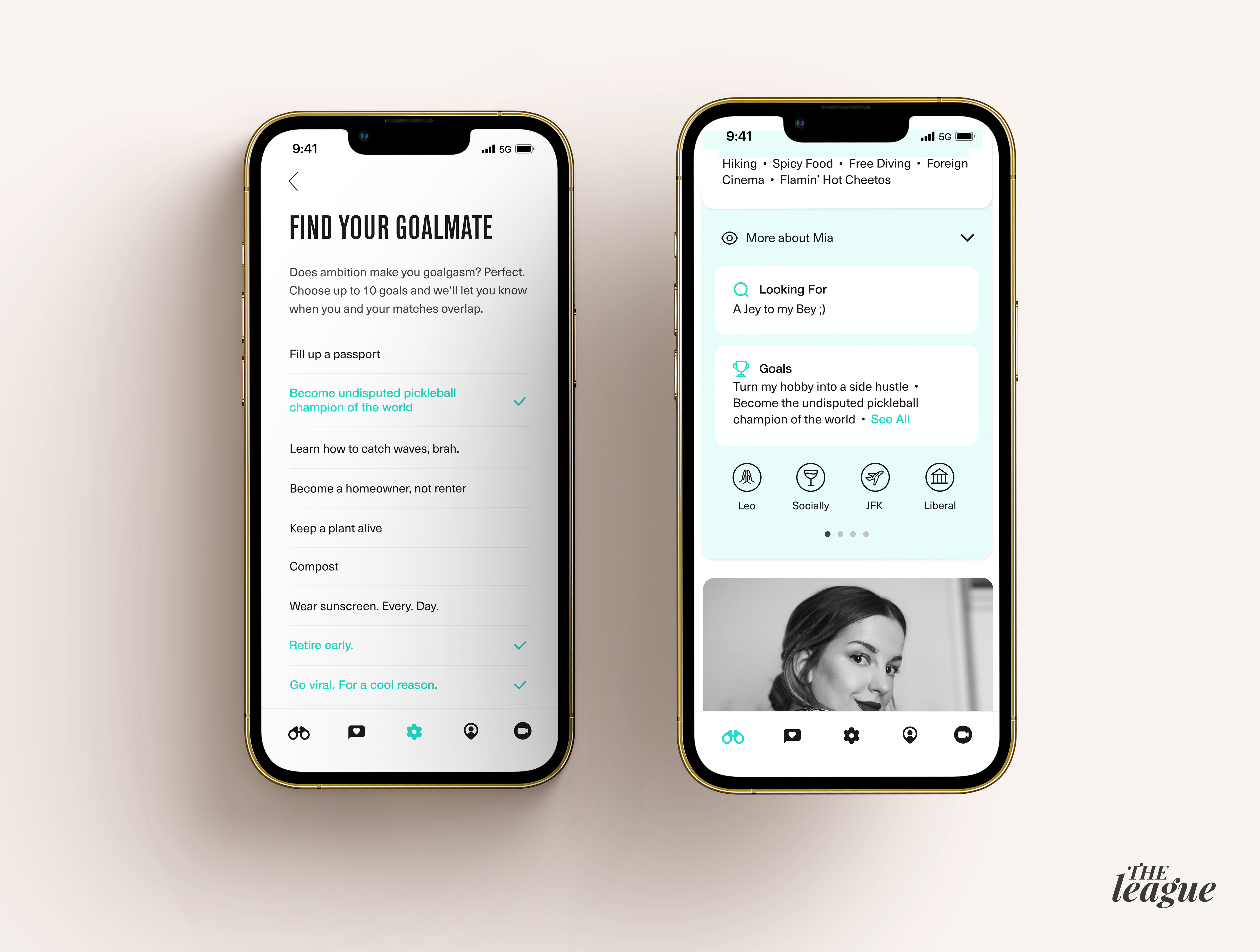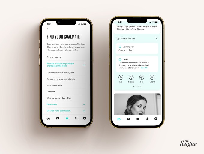 The League gives users a selection of up to 10 goals to showcase on their profile. There are more than 100 options to choose from, ranging from over-ambitious goals like “Climb Kilimanjaro,” “Write the next great American Novel” and “Fill up a passport” to more achievable goals like “Keep a plant alive,” “Become less terrible at surfing” and “Turn my hobby into a side hustle.”