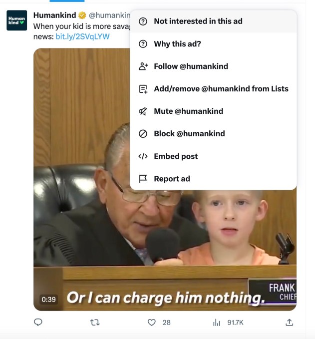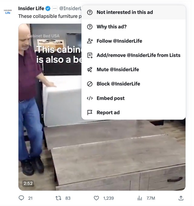 In our tests, we came across a good handful of unlabeled ads from accounts we didn’t follow. In fact, the only indication they were an ad was by clicking on the three-dot menu at the top-right of the post. When you click this menu on an ad, you’re presented with various engagement options like “Not interested in this ad” or “Why this ad?” as well as tools to follow the account, mute it, block it and more.