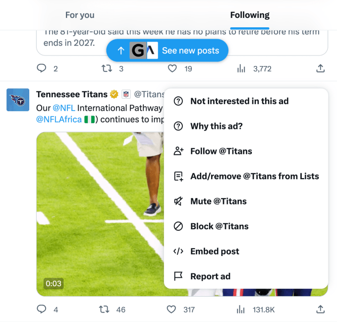 Now, the word “Ad” appears on the top-right of a post, next to the poster’s name and @username — a placement that some critics said made the ads less noticeable.