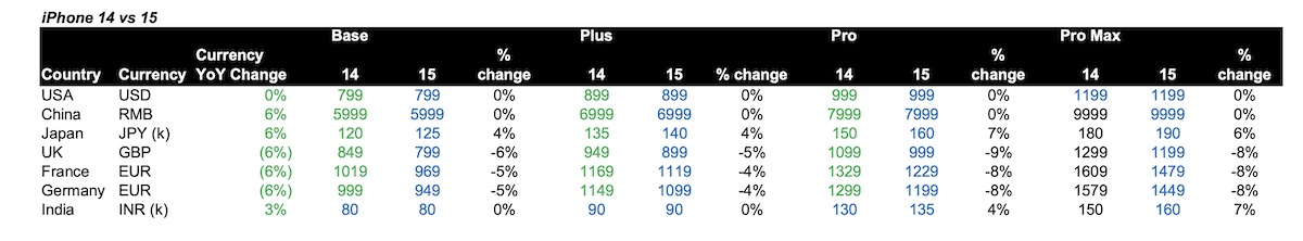 “Per usual, Apple did move international prices of iPhones, largely to reflect currency movements. However, in contrast to last year, where a strong dollar drove Apple to raise prices in most foreign currencies in order to keep prices constant in dollar terms, smaller moves in the dollar meant that price adjustments were more mixed, with Apple raising prices in Japan and for the Pro models in India and lowering them in Europe – all in line with currency moves,” analysts at AllianceBernstein wrote in a note to clients Wednesday.
