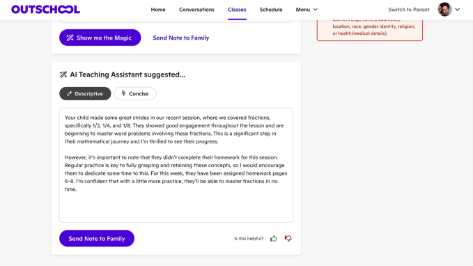Outschool’s new AI tool is designed to help teachers save time on writing progress reports as well as encourage better communication with the learner’s parent or caregiver. After every learning session, tutors enter bullet points into the AI Teaching Assistant detailing how the learner did in class. The AI then generates a few paragraphs that give parents an overview of what the student did that day and how well they performed. Tutors can choose from either a descriptive message or a concise version.