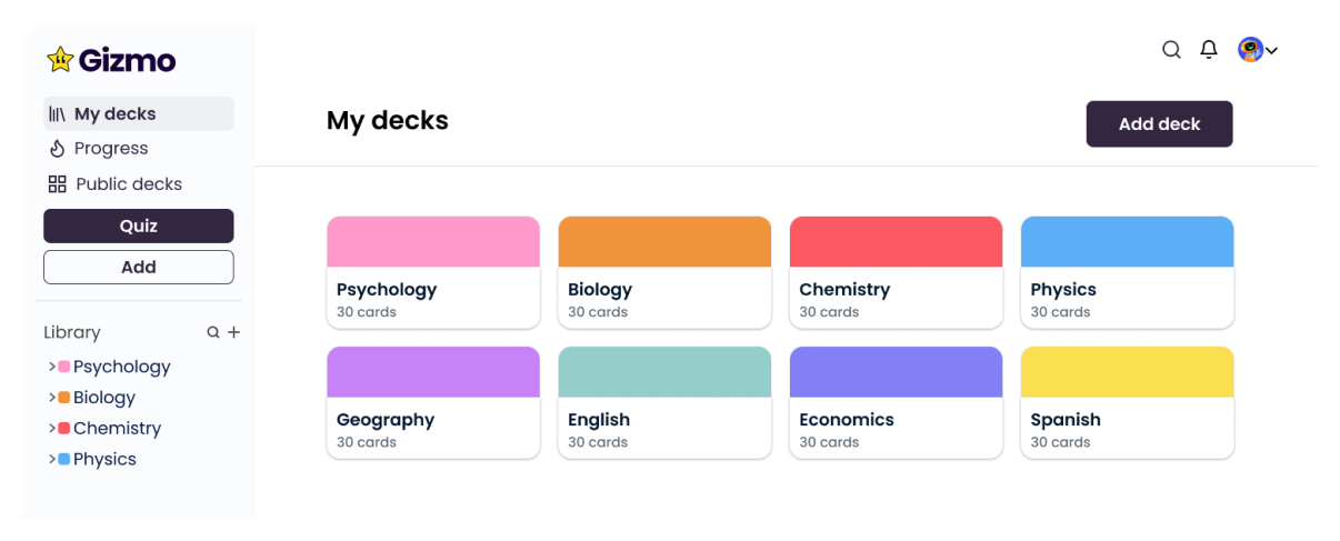 Once a user creates a deck, Gizmo prepares a multiple-choice quiz based on the material. The quizzes use learning science techniques such as active recall and spaced repetition, the company explains, making learning easier and “super efficient.”