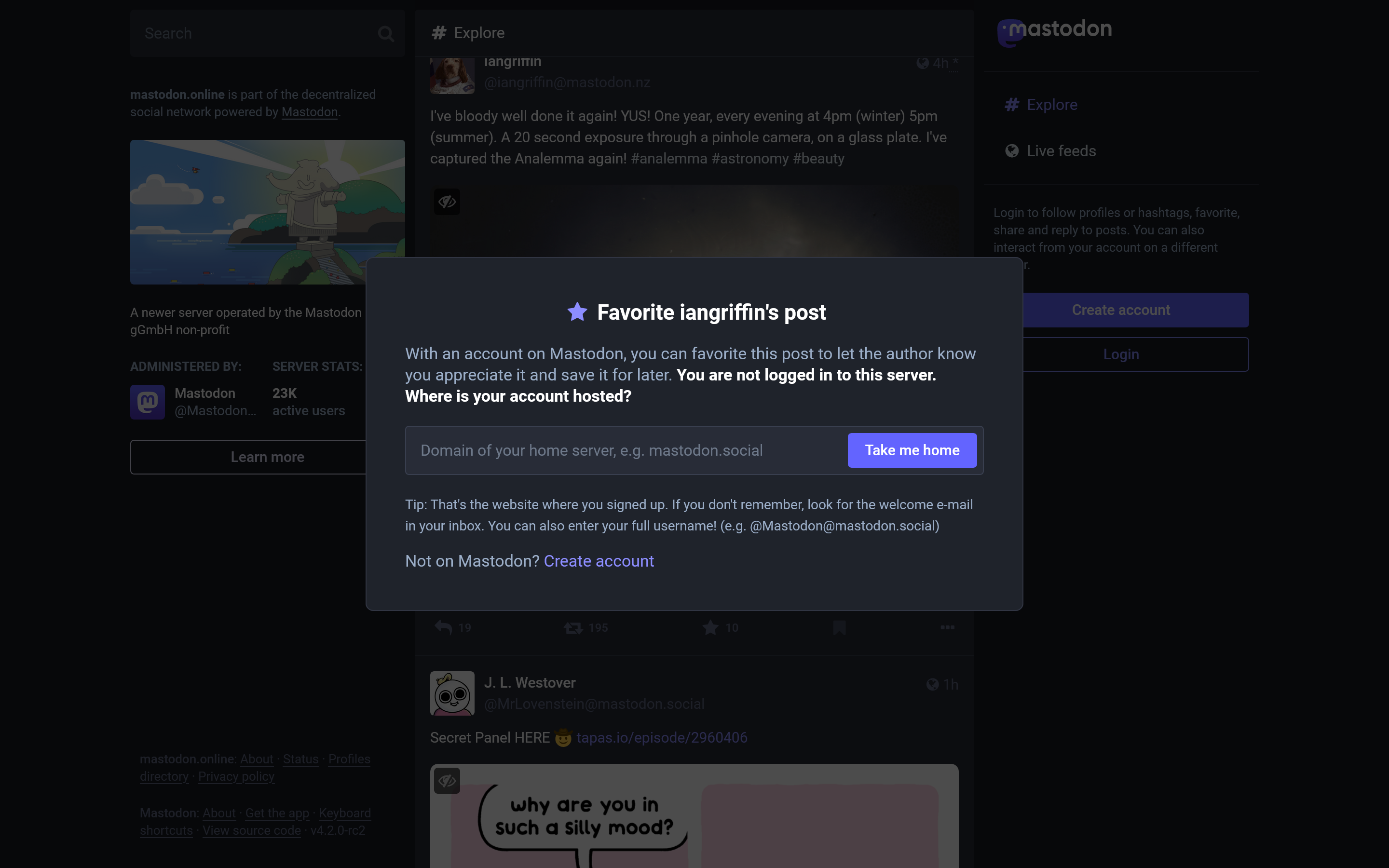 In the new experience, things are a little better, though not as simple as on a centralized network like X or Threads. Now you’ll be asked to type in the domain of your Mastodon home server, which autocompletes as you type, and then you’re redirected to the post or user profile from your logged-in interface, allowing you to take whatever action you intended.
