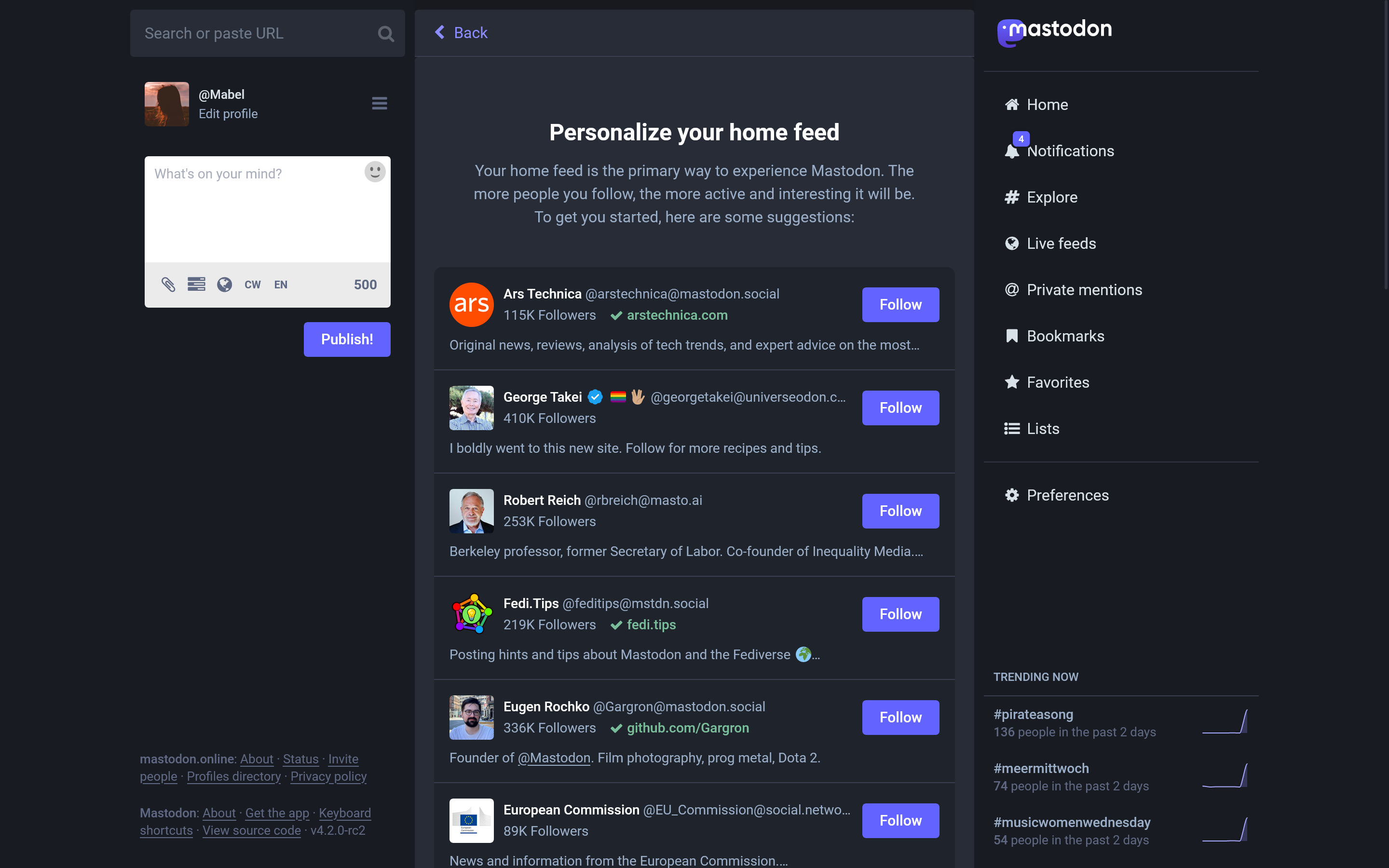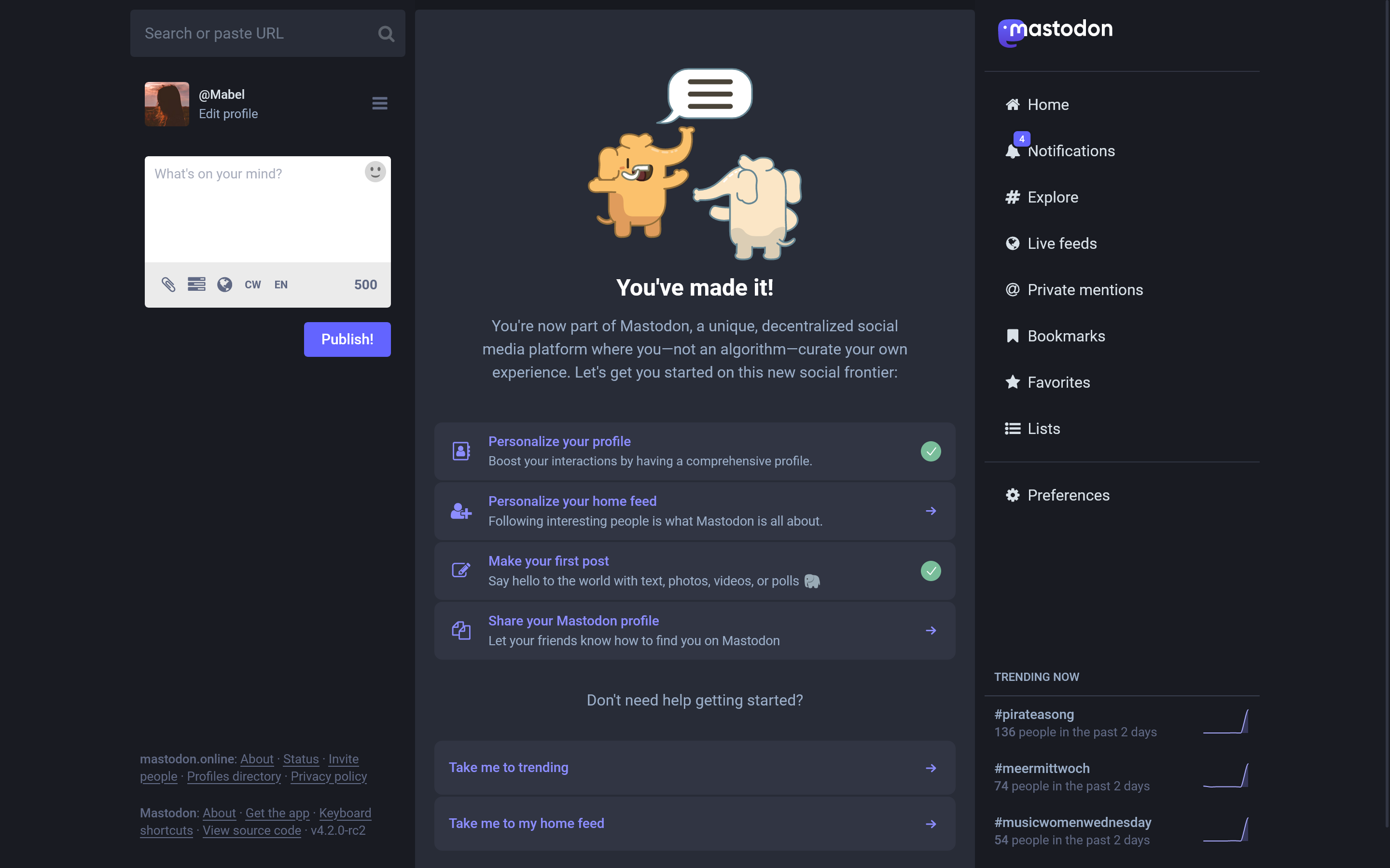 After getting logged in, new users are also pointed to recommended first steps — like filling out their profile, following people (with helpful suggestions), making their first post, and sharing their profile outside Mastodon.