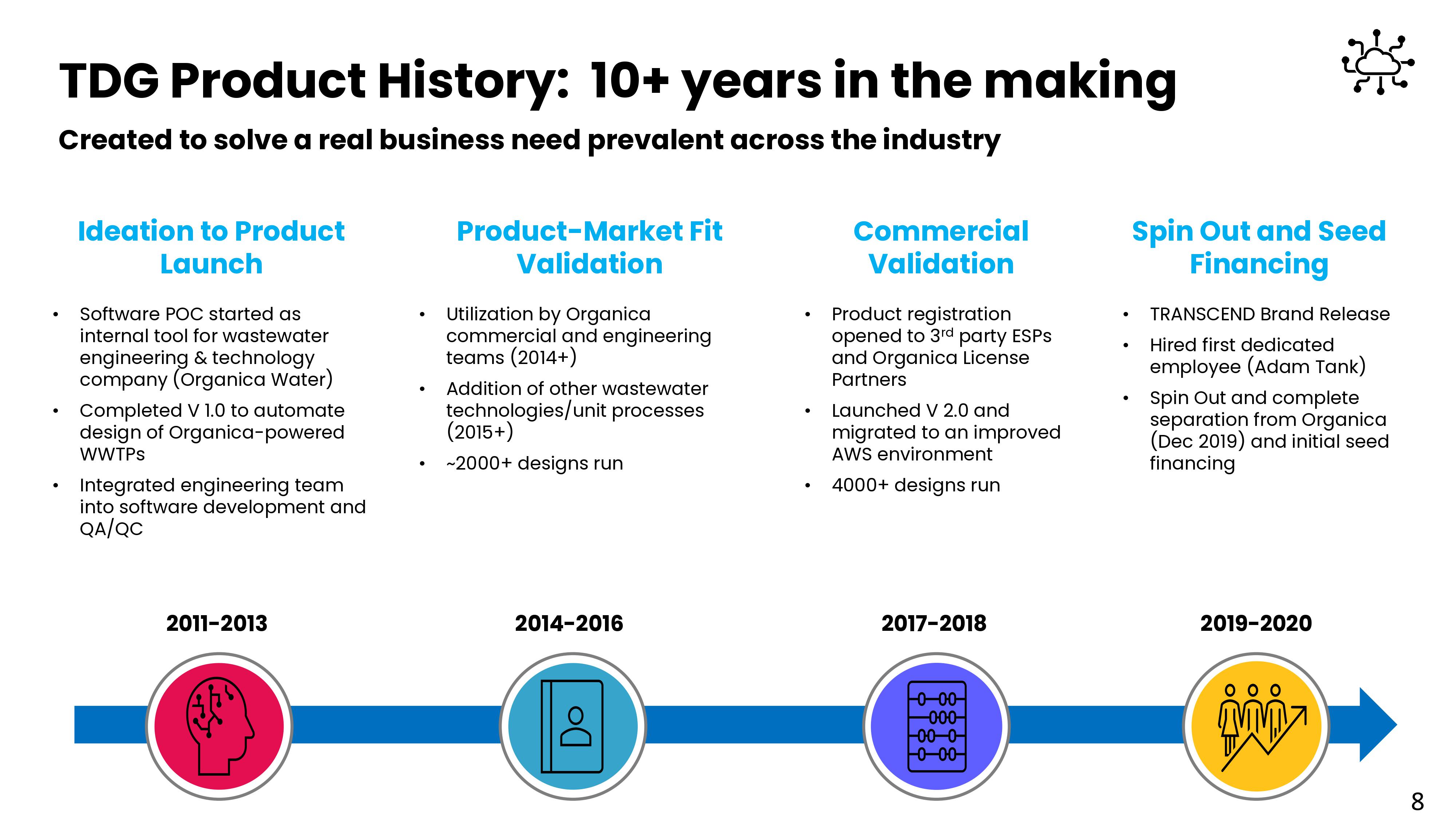 There’s usually a pretty good reason for a startup to spin out of a company. In this case, the tool at the center of Transcend is one that was built internally, before the company originating the tool realized that it might be useful for others. From product to product/market fit, via commercial validation, to a spinout that gets to build its own customer base can be an arduous path. The great thing, in this case, is that the spin-out was completed four years ago. Much of the risk associated with that part of the process should now have been resolved, but the benefits from being a 10-year-old product, rather than an energetic four-year-old should also be visible. Having this slide in the deck helps position the company in time and space (and answers the “why now?” question) .