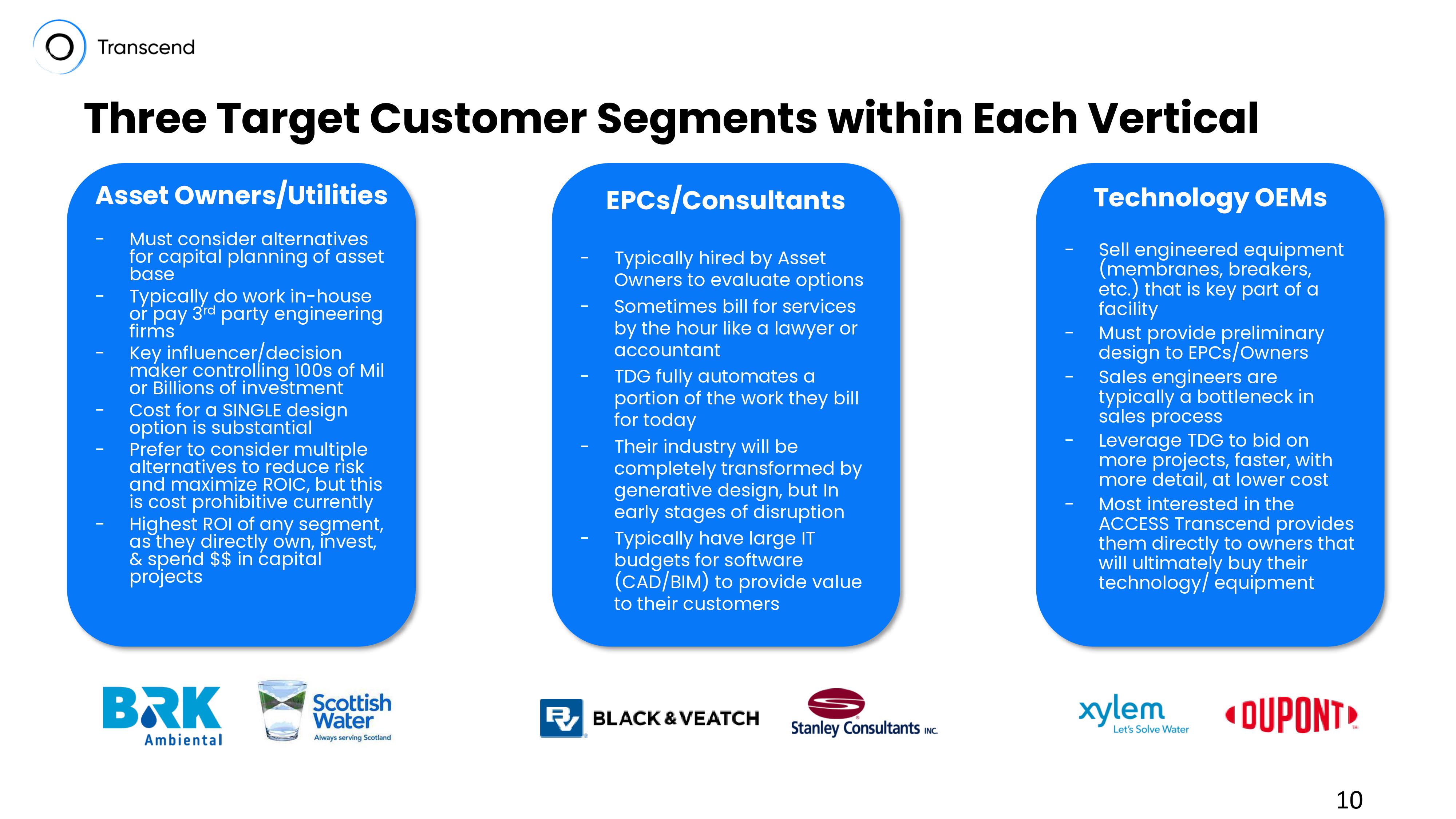 It’s a little odd to have a graph that seems to go up and to the right; you’d expect the Y axis to be “time.” That isn’t the case; this graph describes the various industries. Transcend focuses on three of them (sewer/wastewater, water, and power) and shows that it might potentially expand to others in the future.