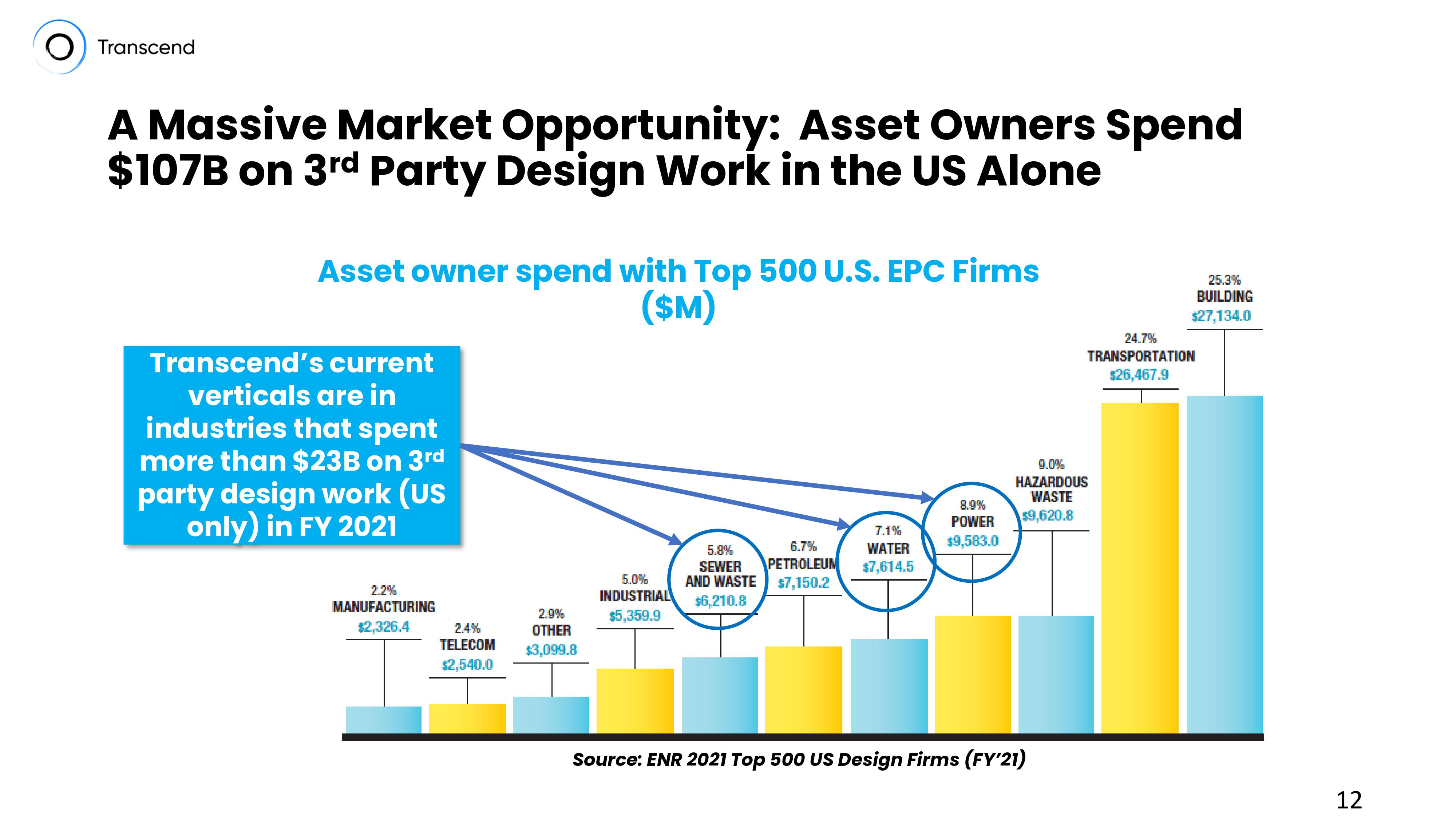 Graphic and information design aside, I love that this slide gives a very clear indication of how big the opportunity is today, and how big it could grow if the company added additional verticals to its focus list. I don’t know this industry well enough to know whether the $100 billion+ spent on design work is a number that Transcend could realistically go after (in other words, if it sucks up the whole market share, would Transcend be a $100 billion per year company? That seems a bit ambitious, but I’m not actually sure how to sense-check that). Presumably, investors who are active in this space would immediately be able to know whether this is realistic.