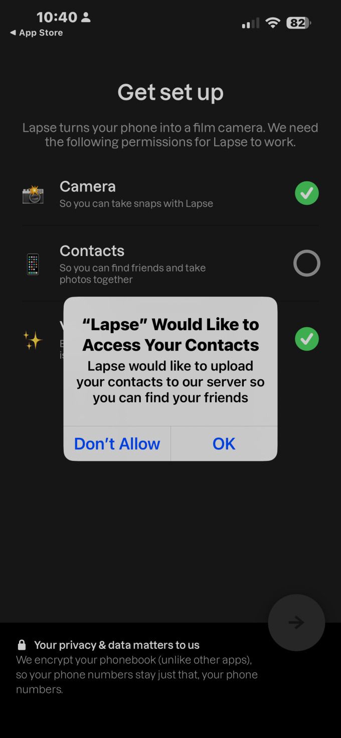 The app features a slick onboarding experience where it presents a fairly lengthy mini-movie with haptics to get you excited about its capabilities. It also verifies users with a phone number, asks for permission to your contacts and camera, and then forces you to add at least five friends before you’re able to use Lapse.