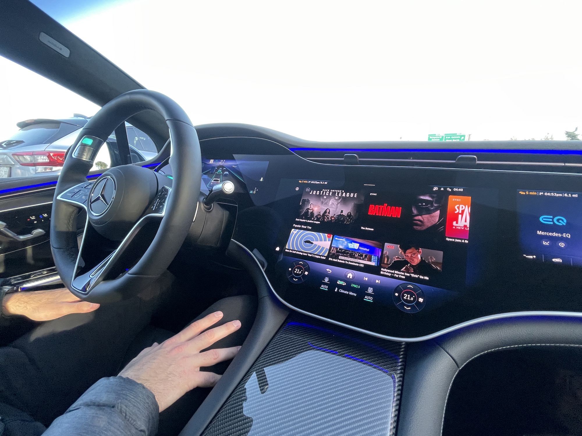 At 3:00 p.m. on a Thursday, I slide behind the wheel of an all-electric EQS with Mercedes representative Lucas Bolster. Our mission: to hit the 10 freeway eastbound from Santa Monica and let the car do the work.