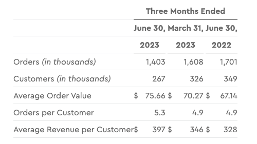 The question at the time, so far as we can parse from where we sit today, was what impact the shakeup in its operations would have on Blue Apron. It reported the following chart in its Q2 2023 results, which shows the decline that the company was fighting against: