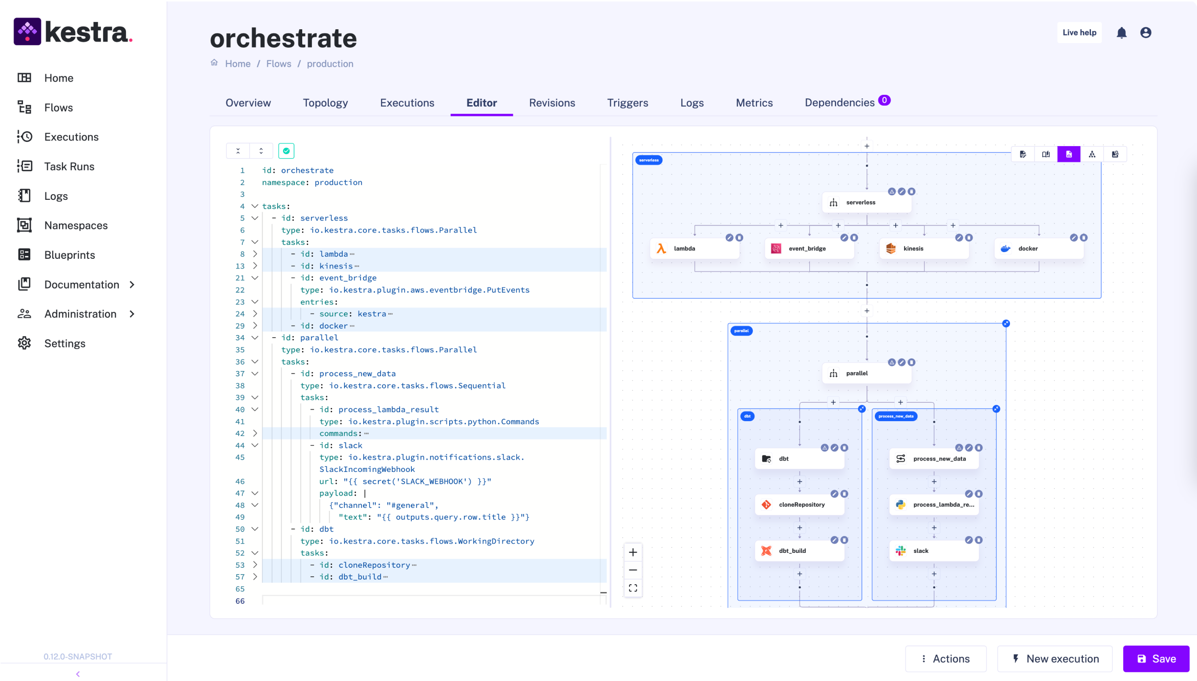 On top of this opinionated approach, Kestra has a solid library of integrations with official plug-ins for major cloud providers (AWS, Azure and Google Cloud), data warehouses (Snowflake and BigQuery), dbt for data transformation, Airbyte for data integration, and more.