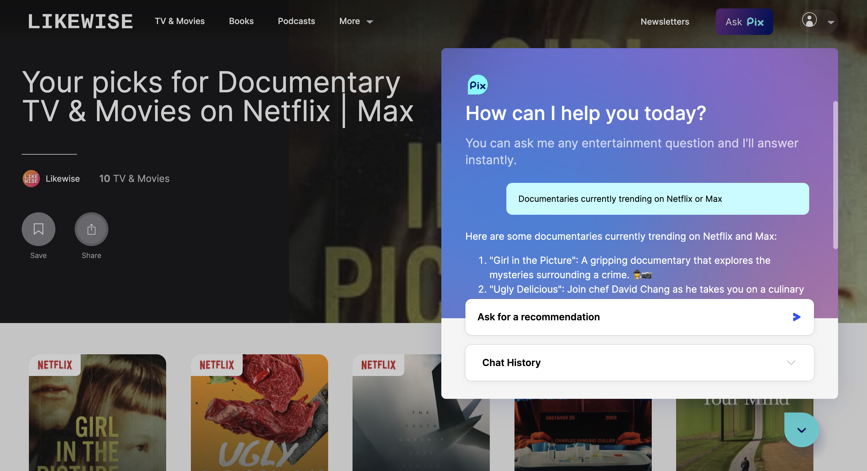 To use Pix, you can ask the chatbot a question like “Can you recommend a scary movie on Prime or Hulu?,” “What’s a thrilling novel similar to The Silent Patient?” or “What are some documentaries currently trending on Netflix or Max?” These questions can be posed to Pix by sending a text (877) TEXTPIX or email pix@likewise.com, as well as in the Likewise app.