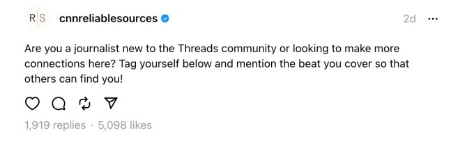 In the meantime, journalists are setting up shop on new networks, hedging their bets against X’s potential to be a useful platform during a fast-moving news event. Over the weekend, a post on Threads from CNN’s Reliable Sources went viral, asking journalists on Threads to self-identify by tagging themselves so others could find them. The post blew up with 1,919 replies and over 5,000 likes — smaller numbers for X, perhaps, but big for Threads.