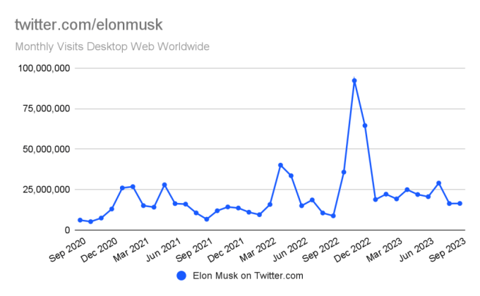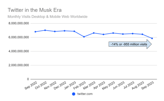 X would likely dispute Similarweb’s findings, as its execs have only touted traffic increases, not declines. The company recently told TechCrunch that X sees 500 million posts per day, including original content, replies and reposts, and noted that X generates 100 billion impressions per day. Yaccarino also shared other figures at an event in October, noting that people are spending 14% more time on X, with a 20% increase in consuming video, and that 1.5 million sign up for X daily, up 4% year-over-year.