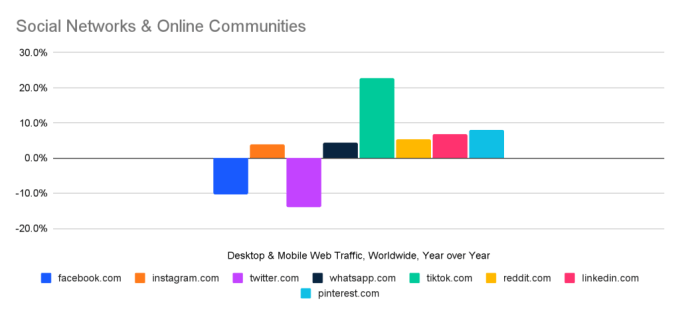 The report also indicates that X’s declines are part of a broader shift, as web traffic to the top 100 social networks and online communities the firm tracks were also down by 3.7% in September, save TikTok, which grew 22.8% on a global basis. Facebook web traffic, for example, was down 10.4%.