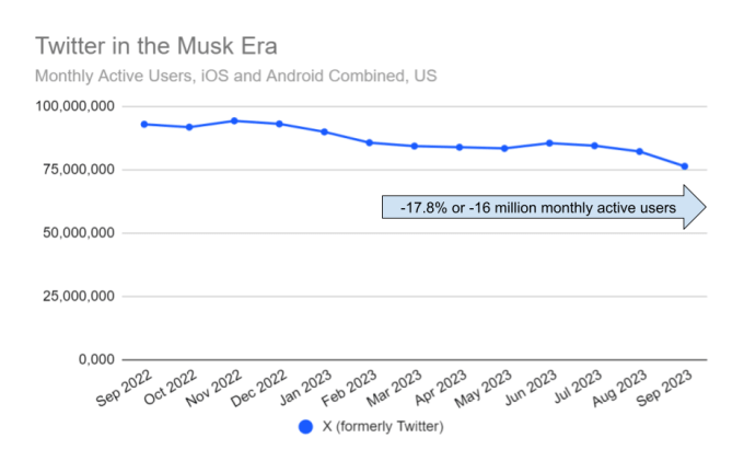 The report notes that September was not just a fluke, either, as declines in usage were visible in long-term trends as well. When comparing the first nine months of 2023 with the same period in 2022, Simiarweb found X’s website traffic was down 11.6% year-over-year in the U.S. and down by 7% worldwide. Mobile app usage in the U.S. was also down by 12.8% during that same period of time.