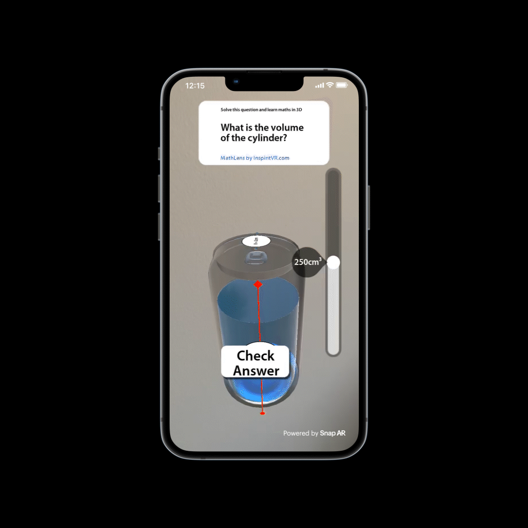 One of the AR Lenses is designed to help students find the volume of a cylinder, while another gets users to tap on bubbles and choose the correct volume to pop them.
