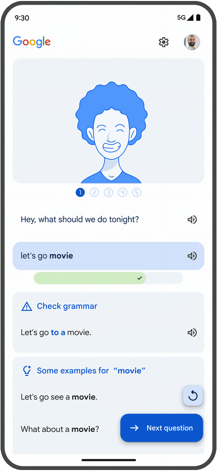 How personalized is it, exactly? Well, according to Google, the experience gives semantic feedback — indicating whether a response was relevant to a given question and comprehensible to a theoretical conversation partner. It also recommends areas where grammar could be improved, and, to give concrete suggestions for alternative ways to respond, provides a set of example answers at varying levels of language complexity.