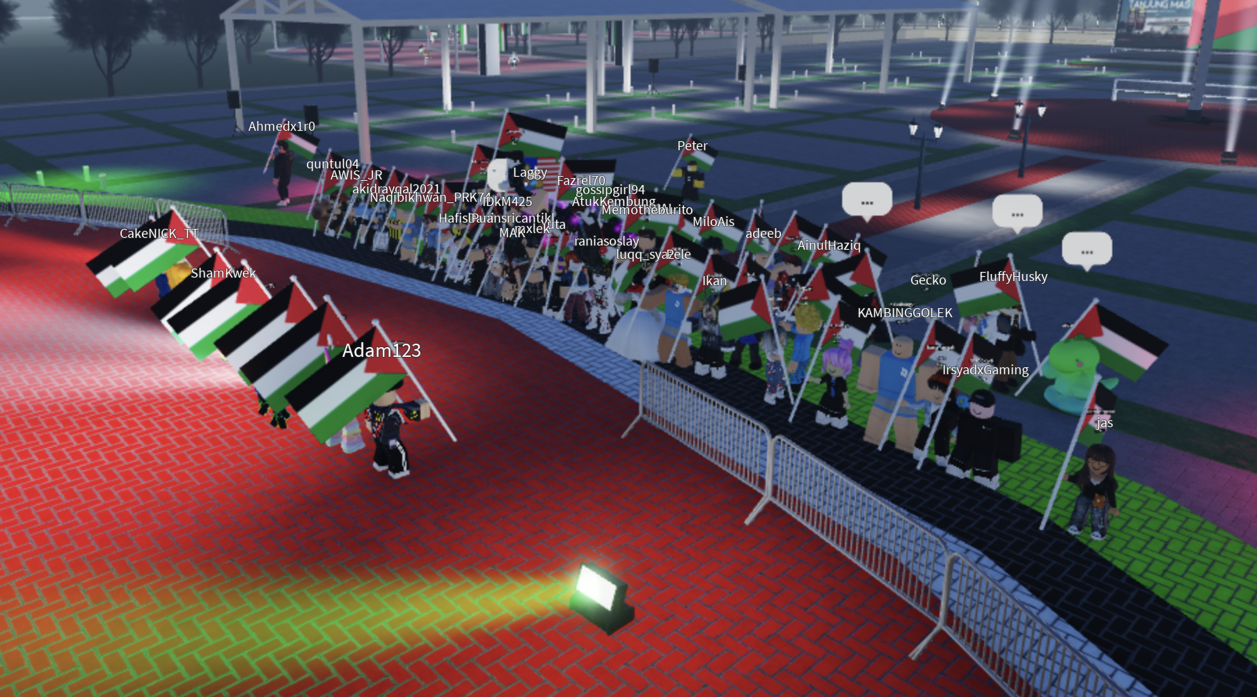 In the Lego-like world of Roblox, about a hundred blocky avatars march through a lamplit street, wielding Palestine flags that are larger than their own animated bodies. Characters dressed like cartoonish dinosaurs, steampunk zombies and pastel pink pop stars chant together via instant messages in both Malay and English as they arrive at a stage, where leaders of the Roblox server stand together to dictate when the next march around the pixelated streets will begin.