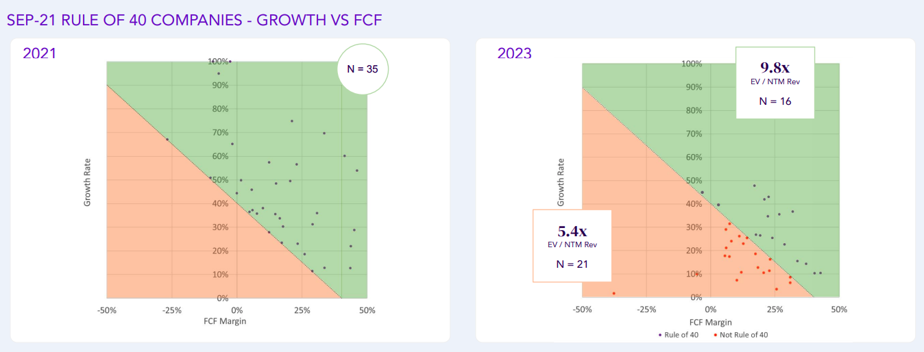 It’s notable that the result of swapping growth for profitability (free cash flow) has not led to more public cloud companies qualifying for the Rule of 40. In fact, we’re seeing the opposite happen:
