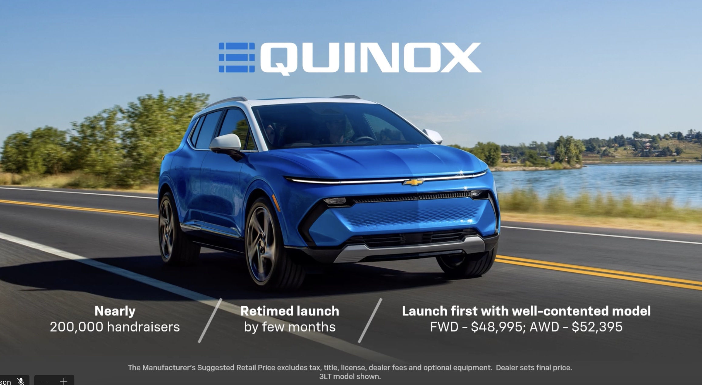 The timing of Chevy Equinox EV’s arrival is also important. The company will likely want to introduce the Equinox EV as the last Chevy Bolt and Bolt EUVs are sold, which is expected by spring. GM said it will end production of the Chevy Bolt and Bolt EUV at the end of year and will bring back a next-generation version in 2025.