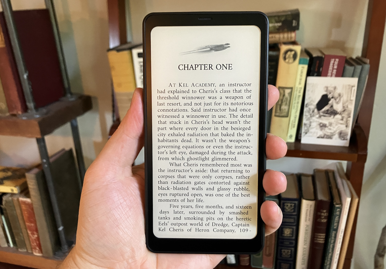 For me, it’s a little distracting to have this aspect ratio instead of the more paperback-esque dimensions of the others. It’s hard for me to imagine I’m reading a book when there are only eight words per line at maximum. The resolution of the screen does make smaller font settings work perfectly well on the Palma, though. I was trying to picture what it would be like a little wider, with thinner bezels… and realized I was picturing the Poke 5.